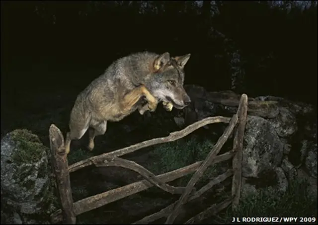 O fotógrafo espanhol José Luis Rodríguez disse que esperou semanas para conseguir a foto perfeita, entre convencer um fazendeiro a deixar que um lobo selvagem entrasse em suas terras, atrair o lobo com um pedaço de carne e ganhar sua confiança para instalar o equipamento.