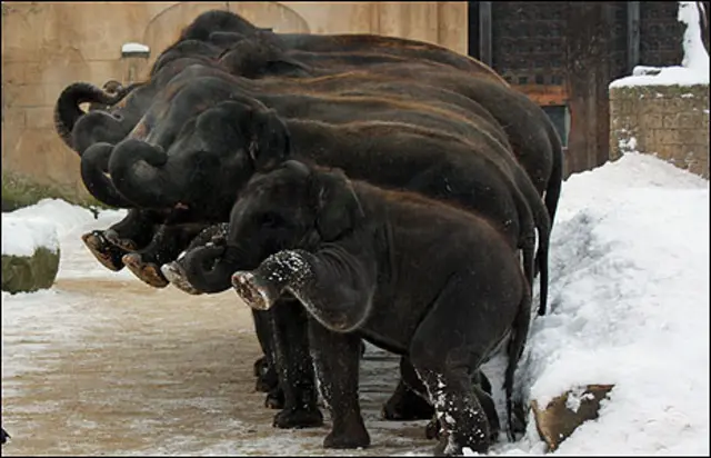 Mesmo agora, sob o rígido inverno alemão, as futuras mães não deixam de exercitar, e contam até com a companhia dos bebês elefantes Tarak e Shanti, filhos de Khaing Hnin Hnin, uma das grávidas.