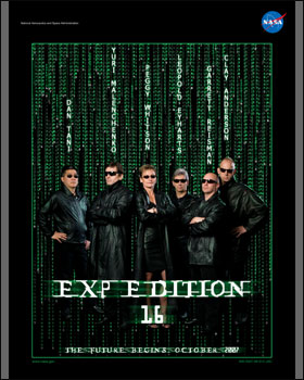 O cartaz da expedição, que levou três astronautas à estação Espacial Internacional, foi baseado no pôster do filme de ficção científica Matrix.