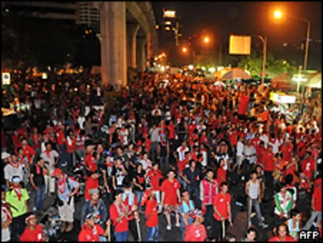 Os manifestantes estão acampados há seis semanas na capital e exigem que o governo dissolva o Parlamento e convoque eleições diretas, pois afirmam que a eleição do primeiro-ministro Abhisit Vejjajiva, por voto parlamentar, não foi legal.