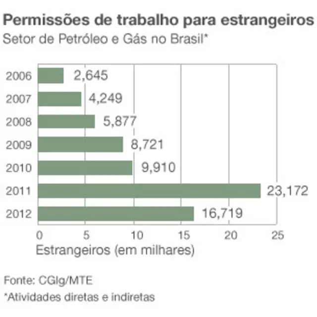 Um levantamento feito pela BBC Brasil com a Coordenação Geral de Imigração (CGIg), que faz parte do Ministério do Trabalho em Emprego (MTE), mostra que 49.801 profissionais de países como a Grã-Bretanha, Estados Unidos, Noruega, Holanda e França entraram no Brasil entre 2010 e 2012 para trabalhar no setor de petróleo e gás.