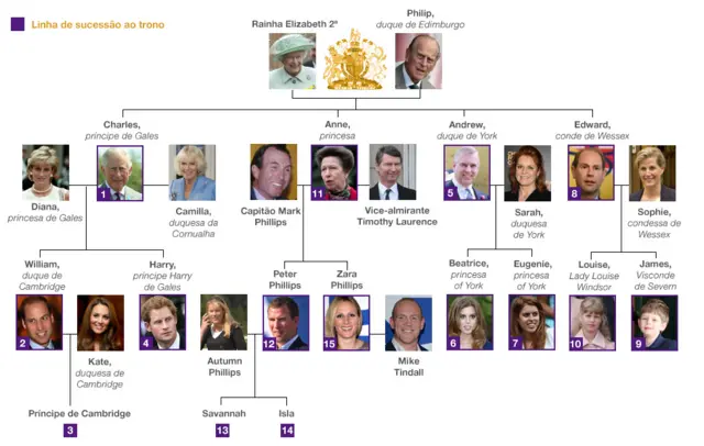 Veja no gráfico abaixo a árvore genealógica da família real britânica e a ordem que define a linha de sucessão ao trono (os números nos quadrados roxos indicam a posição na linha de sucessão).
