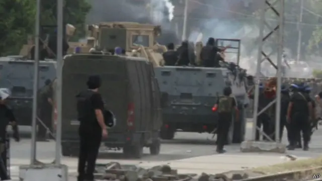 Escavadeiras foram usadas para derrubar muros levantados pelos manifestantes fora da mesquita Rabaa al-Adawiya, segundo o correspondente da BBC James Reynolds.