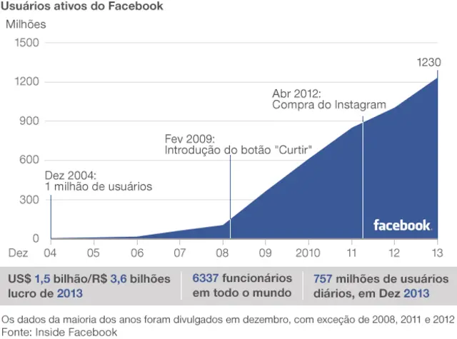 Em dez anos, o Facebook passou de uma página restrito a estudantes a um site com 1,2 bilhão de usuários em todo o mundo, 750 milhões dos quais acessam a rede social ao menos uma vez por dia. Desde seu lançamento, foram mais de 4 bilhões de “curtidas” diárias, totalizando 1,3 trilhão nessa última década.