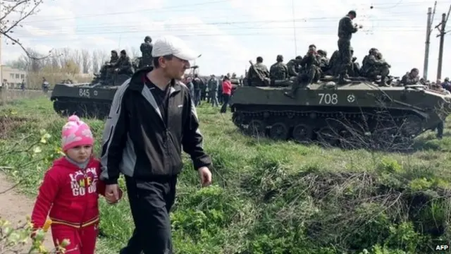 Tanques e veículos blindados ucranianos foram bloqueados por civis pró-Rússia ao entrarem na cidade de Kramatorsk, no leste do país.