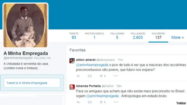 "Meu objetivo com a página é apontar o racismo e o preconceito. Muitas vezes as pessoas nem percebem que estão sendo preconceituosas e a ideia é ajudá-las a se ligarem nisso", disse à BBC Brasil o criador da página <link type="page"><caption> @aminhaempregada</caption><url href="https://twitter.com/aminhaempregada" platform="highweb"/></link>, que em 48 horas ganhou mais de 2,6 mil seguidores na rede social.