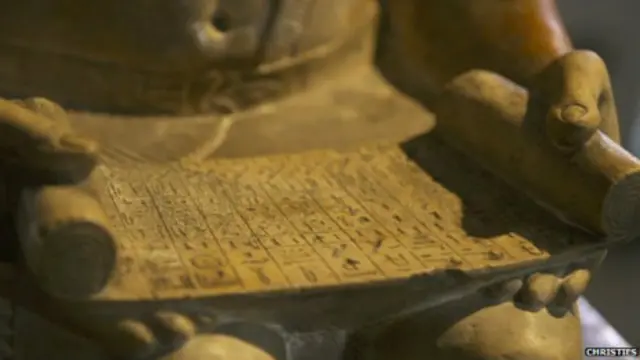 The 4,000-year-old limestone statue of an official called Sekhemka is about 75 cm tall. It shows him sitting, reading a scroll with his much smaller wife kneeling beside him.
