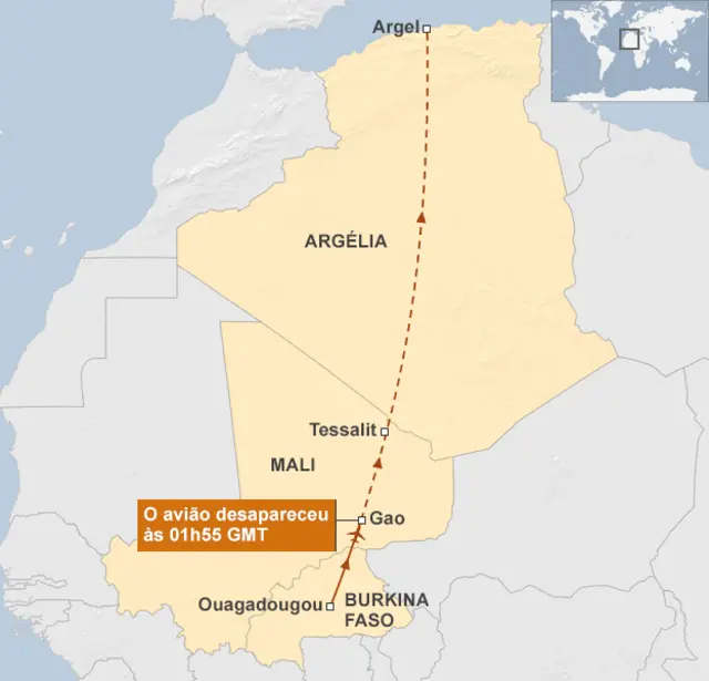 O avião voava de Burkina Faso para Argel, capital da Argélia, pelo Deserto do Saara. <link type="page"><caption> Clique aqui para ver um mapa da rota.</caption><url href="#1" platform="highweb"/></link>