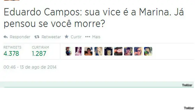 À meia noite e quarenta e seis desta quarta-feira, quase 10 horas antes da queda do avião que levava Eduardo Campos a Santos (SP), uma internauta tuitou: "Eduardo Campos: sua vice é a Marina. Já pensou se você morre?".