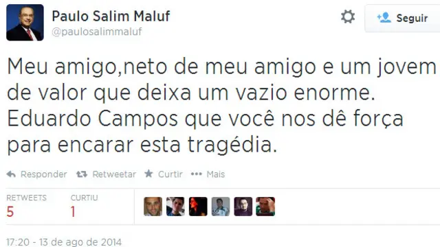 Paulo Maluf (PP): "Meu amigo, neto de meu amigo e um jovem de valor que deixa um vazio enorme. Eduardo Campos, que você nos dê força para encarar esta tragédia."