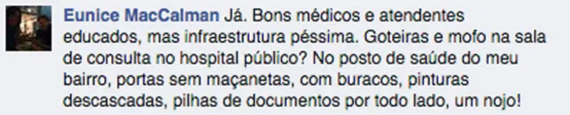 "Eu tenho plano de saúde, mas os planos não estão mais funcionando no Brasil. Então apelei para o SUS, porque estava tendo dores de cabeça muito fortes. Foram todos muito atenciosos e eu voltei para casa feliz. O problema é marcar a consulta."