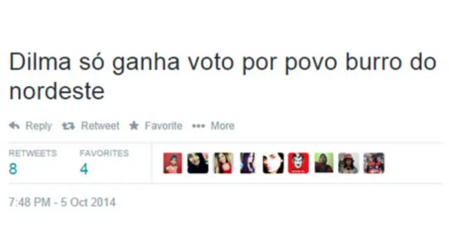 No último dia 5 de outubro, assim que a apuração de votos das eleições começou nas regiões Norte e Nordeste, surgiram nas redes sociais diversos comentários preconceituosos tendo como alvo nordestinos, associando-os ao bom desempenho de Dilma Rousseff (PT) na região e à performance mais tímida do rival, Aécio Neves (PSDB), nas mesmas regiões.