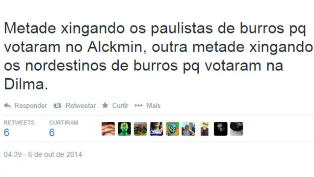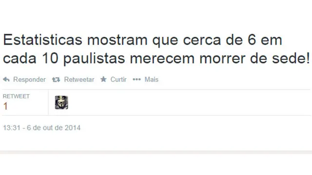 "Eu tô vendo que vai todo mundo morrer em grande estilo lá em são paulo (jogados na sarjeta)", escreveu um eleitor. "São Paulo elegendo Russomanno, Tiririca e Feliciano. Bora insultar os paulistas?", tuitou outro. "Povo burro, ainda irão morrer de sede e fome: paulistas", postou uma terceira.