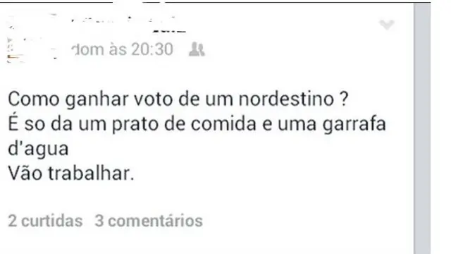 No outro extremo, comentários preconceituosos alvejando nordestinos renderam a criação de um Tumblr: <link type="page"><caption> Esses Nordestinos....</caption><url href="http://essesnordestinos.tumblr.com/" platform="highweb"/></link>