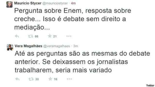 "Pergunta sobre Enem, resposta sobre creche... Isso é debate sem direito a mediação", tuitou o jornalista Maurício Stycer.