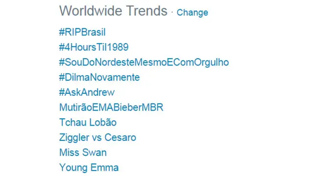 O ranking trazia, em primeiro lugar, a hashtag "#RIPBrasil" (a sigla significa "rest in peace", ou "descanse em paz"). Os principais comentários eram de eleitores de Aécio Neves (PSDB) frustrados com a derrota por menos de 2 pontos percentuais.