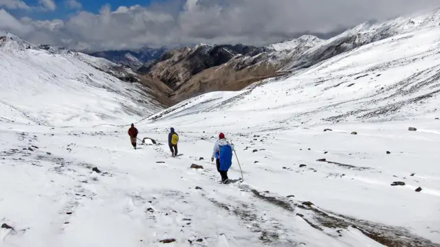 A visibilidade dos viajantes ficou limitada a dois metros. Sem a ajuda de um guia local, seria impossível completar a trilha. Assim que a tempestade passou, eles começaram uma descida de 1,5 metros em direção a um mosteiro budista do século 11.
