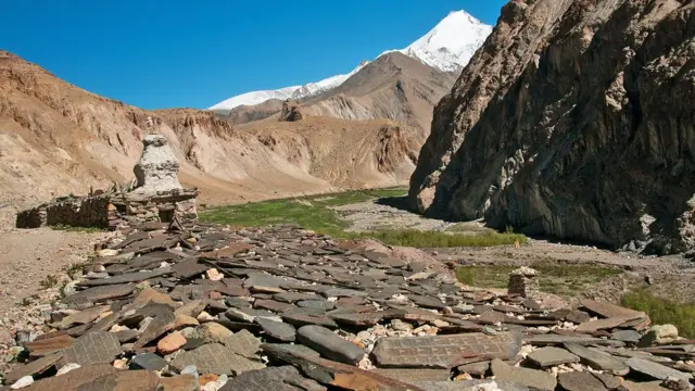 As pedras mani são rochas achatadas com gravuras tibetanas. Nelas, é possível ler o mantra "om mani padme hum", uma frase que poderia ser traduzida livremente como "saudação à joia do lótus". Ao longo dos anos, as pilhas de rochas vão crescendo, já que os peregrinos acrescentam mais manis ao local.