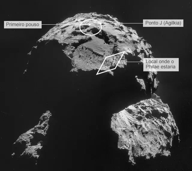 O 67P, de 4 km de largura, tem pouca gravidade. Por isso, ante a falha dos sistemas de pouso do robô - que não conseguiram prendê-lo à superfície do cometa no momento da aterrissagem, a Philae se deparou com uma superfície que a fez ricochetear.