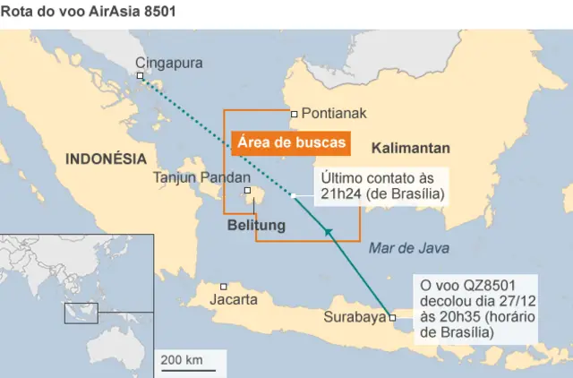 As buscas pelo avião acidentado estão se concentrando no Mar de Java, entre as ilhas indonésias Belitung e Kalimantan. Aeronaves e embarcações de diversos países estão participando da operação.