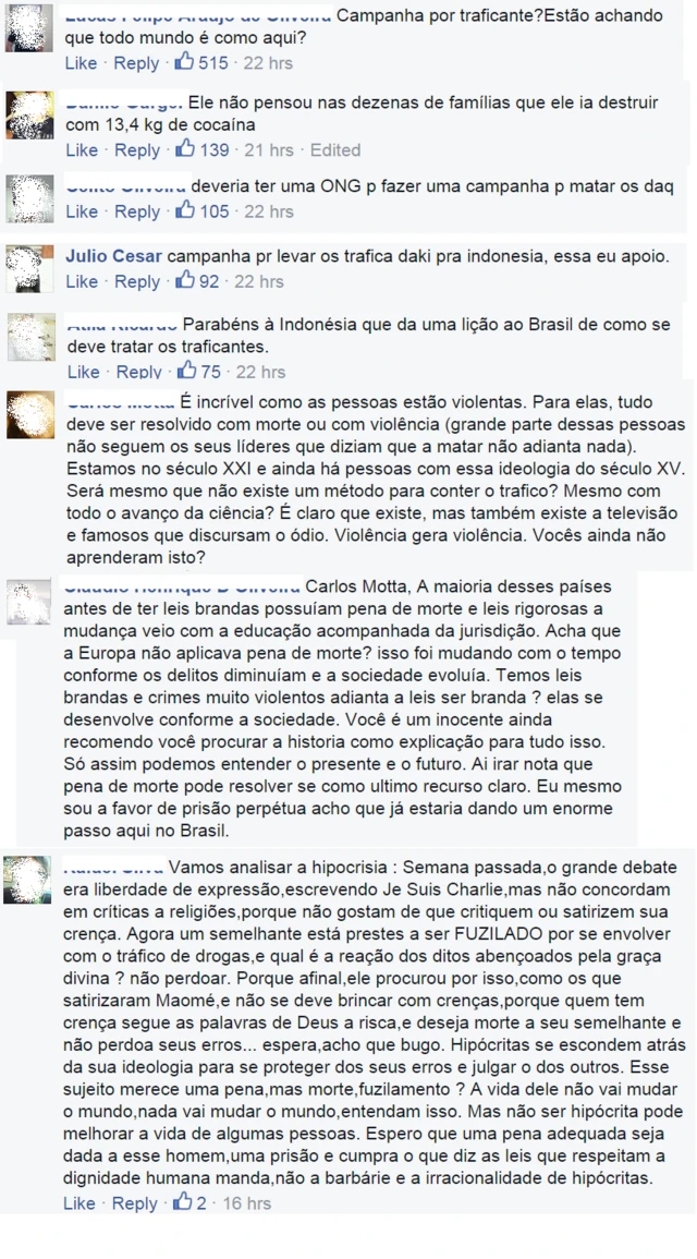 O assunto gerou 1.250 comentários inflamados em menos de 24 horas na página da BBC Brasil no Facebook. Enquanto uma minoria defende clemência, penas alternativas e prega a ineficiência da pena de morte, os comentários mais elogiados sugerem que traficantes deveriam morrer "para dar exemplo".