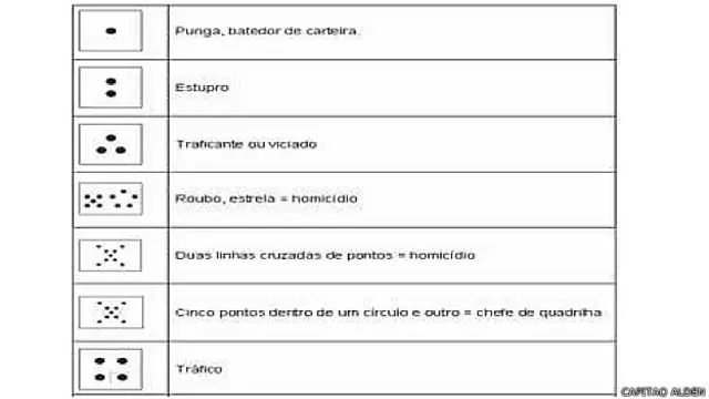 Um só ponto preto indicaria "batedores de carteira". Dois, na vertical, sugerem estupro. Três pontos, em formato de pirâmide, apontam relação com entorpecentes.
