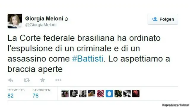 A líder do partido de direita Fratelli d’Italia (Irmãos da Itália), Giorgia Meloni, disse via Twitter que o Brasil "ordenou a expulsão de um criminoso e assassino", e acresce: "O esperamos de braços abertos".