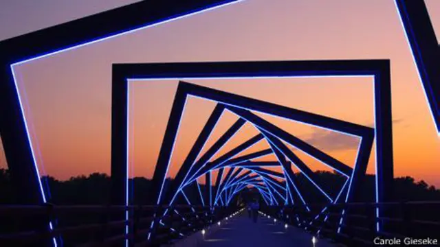 O estúdio do designer americano David Dahlquist criou 41 quadrados de aço que foram posicionados em diferentes angulações ao longo da ponte para simular a visão que se tem de dentro de uma mina, em uma referência ao passado minerador da região.