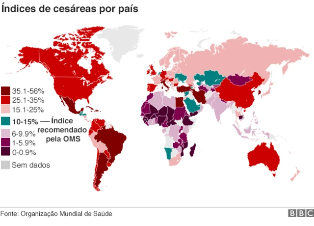 A cirurgia é cada vez mais simples e segura e pode ser necessária para salvar gestante e bebê quando é identificado riscos na realização do parto normal. Mas a cirurgia ainda implica em perigos, e o número de cesarianas feitas por opção da mãe, sem recomendação médica, vem aumentando - um problema que não é exclusivo do Brasil, como mostram as áreas em vermelho do mapa acima.