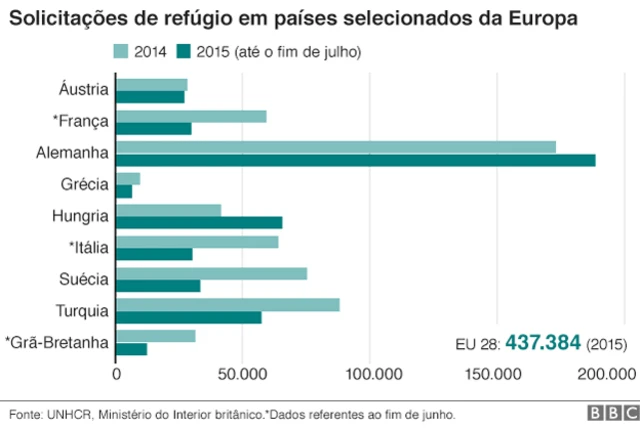 No total, 438 mil refugiados pediram asilo em países do bloco até o fim de julho deste ano – comparados com os 571 mil para 2014.