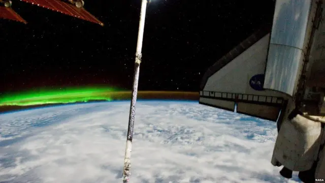 Mas note também a asa da nave espacial da Nasa Atlantis no primeiro plano. Ela havia saído da Terra em um missão de 12 dias para levar suprimentos.