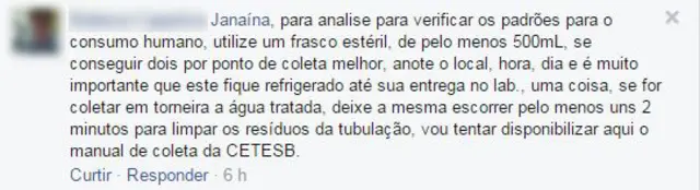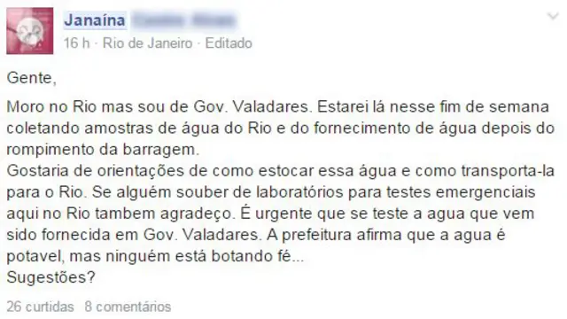 "Acredito que a prefeitura esteja sofrendo uma pressão política grande e quero ajudar a fazer uma análise da água. Vou tentar eu mesma fazer quando estiver lá ou pedir a um primo e outras pessoas. É necessário fazer uma análise mais completa e autônoma tanto de materiais inorgânicos (metais, por exemplo) quanto orgânicos", afirma.