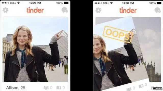 O Tinder funciona assim: o usuário vê a foto de uma pessoa e, se gostar, desliza a tela para a direita (ou clica duas vezes para indicar que gostou daquela pessoa). Se não, desliza para a esquerda, e essa pessoa desaparece do seu "catálogo" de perfis.