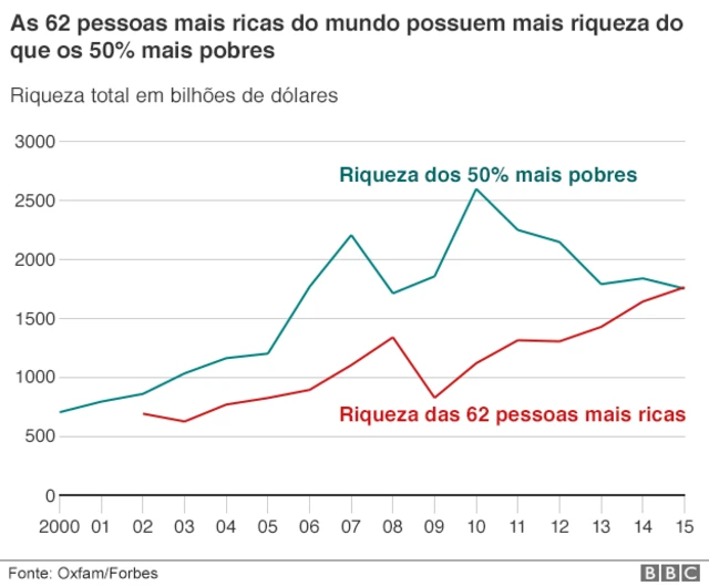 O relatório também diz que as 62 pessoas mais ricas do mundo têm o mesmo – em riqueza v que toda a metade mais pobre da população global.