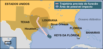 O governo do Texas, Rick Perry, anunciou, nesta sexta-feira, que está esperando um "evento catastrófico" à medida que o furacão Rita se aproxima da costa do Golfo do México. Segundo novas estimativas das autoridades locais, 5,2 milhões de pessoas serão afetadas pelo furacão, 6 mil casas deverão ser destruídas e 16 mil pessoas ficarão desabrigadas. Perry também disse que prevê a inundação total de Port Arthur, uma cidade costeira de cerca de 58 mil moradores. Às 11h, hora local (12h em Brasília), o olho do Rita esta a cerca de 340 km de Port Arthur. O presidente americano, George W. Bush, deve ir à região nesta sexta-feira para verificar os preparativos para a chegada do furacão. Ônibus Uma das maiores evacuações em massa da história americana está sendo realizada no Texas, com 2 milhões de pessoas se dirigindo para o interior enquanto a região da costa do Golfo do México se prepara para a chegada do furacão. Algumas das cidades que estão na rota do furacão foram quase completamente evacuadas, como Galveston, que deve ser o local onde o Rita deve chegar à terra Um ônibus levando idosos que haviam sido retirados das áreas que estão na rota do Rita pegou fogo nesta sexta-feira em Dallas, matando cerca de 20 pessoas. O acidente provocou a paralisação do tráfego na rodovia interestadual 45, que já enfrentava graves congestionamentos por conta do fluxo de veículos com moradores deixando a região. Segundo declarações de um porta-voz da polícia local à agência de notícias Associated Press, o fogo pode ter sido provocado pelas garrafas de oxigênio usadas por alguns dos 45 idosos que estavam no ônibus. Resgate As autoridades do Texas pediram ao governo federal para colocar dez mil soldados de prontidão para ajudarem nos trabalhos de resgate que podem ser necessários depois da passagem do furacão Rita. O cônsul brasileiro em Houston, Carlos Alberto Azevedo Pimentel, disse que as instalações do consulado já foram fechadas e que ele se dirige para a cidade de Dallas, segundo a enviada especial da BBC Brasil ao Texas, Denize Bacoccina. As autoridades americanas disponibilizaram uma grande frota de ônibus para retirar das áreas mais vulneráveis pessoas que não têm transporte. Foram armazenados suprimentos de água e alimentos, e a Guarda Nacional está em estado de alerta. Produzindo ventos de 217 km/h, Rita foi rebaixada da categoria cinco (a mais alta da escala Saffir-Simpson) para a quatro – a mesma em que estava o Katrina quando atingiu a costa do Golfo do México há cerca de três semanas. Uma mudança de curso em relação à trajetória inicialmente projetada indica que Rita poderia poupar Houston e Galveston de um impacto direto. De acordo com as novas previsões do Centro Nacional de Furacões, a tempestade está se deslocando no sentido oeste-noroeste e o centro de Rita deve se aproximar do sudoeste da Louisiana e do nordeste da costa do Texas nesta sexta-feira à noite.