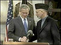 O presidente americano, George W. Bush, fez uma visita surpresa ao Afeganistão nesta quarta-feira e elogiou o progresso da democracia no país. Os Estados Unidos ajudaram a derrubar o regime do Talibã em 2001. Bush disse ao presidente Hamid Karzai que seu país está "inspirando outros". O presidente americano se disse confiante de que Osama Bin Laden será levado à justiça. Apoio moral Na visita, cujos preparativos foram mantidos em segredo por razões de segurança, Bush aproveitou a viagem que tinha marcada para a Índia e antecipou a ida para fazer sua primeira visita ao Afeganistão. Bush chegou à base aérea americana de Bagram e foi levado de helicóptero para um encontro com Karzai no palácio presidencial. Em uma entrevista coletiva com Karzai, Bush disse ao povo afegão que a democracia no país está se fortalecendo: "Vocês estão inspirando outros e a inspiração vai fazer com que outros exijam sua liberdade". Sobre Bin Laden e o líder do Talibã, Mullah Omar, que estão sendo procurados há quatro anos sem sucesso, Bush disse que "não é uma questão sobre se eles serão levados à justiça, mas quando". O presidente americano também citou o Irã, dizendo que se o país fabricar armas nucleares, esta seria "a coisa mais desestabilizadora que poderia acontecer na região".
