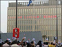 O governo dos Estados Unidos está acusando Cuba de ter cortado intencionalmente a eletricidade de sua missão diplomática no país caribenho. Segundo Sean McCormack, um porta-voz do Departamento de Estado americano, o edifício que abriga a representação americana está há mais de uma semana sem luz e também têm sofrido interrupções em seu fornecimento de água. De acordo com o porta-voz, o corte no suprimento de energia é uma tática de intimidação por parte de Cuba. McCormack acrescentou que o prédio da embaixada é o único no bairro afetado pelo corte de energia. O governo americano e o de Cuba têm travando uma guerra de mensagens nos arredores da missão diplomática. Batalha na fachada Em janeiro, os americanos instalaram painéis luminosos em frente à fachada da embaixada com mensagens sobre direitos humanos, como "Em um país livre, você não precisa de permissão para deixar o país. Cuba é um país livre?". Cuba respondeu à iniciativa americana com uma instalação artística que consiste em uma série de bandeiras negras dispostas em frente ao edifício para dificultar a visibilidade dos letreiros luminosos. A instalação com 148 bandeiras homenageia o que o governo cubano chama de vítimas de 150 anos de resistência cubana contra invasores estrangeiros. Há dois anos, os americanos enfureceram o governo cubano ao erguer um cartaz com um Papaei Noel iluminado, um boneco de neve e o número 75, uma referência ao número de dissidentes políticos que tinham sido presos em Cuba um ano antes. Em resposta, Cuba dispôs quase em frente à embaixada um grande outdoor com os dizeres "fascistas made in USA", acompanhado de ilustrações com a suástica e imagens de presos submetidos a torturas por tropas americanas na prisão de Abu Ghraib, no Iraque. |