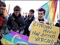 Milhares de pessoas se reuniram na capital italiana, Roma, com o apoio da Igreja Católica, para se manifestar contra uma legislação que ampliaria direitos de casais não-casados - inclusive homossexuais - no país. Organizadores do Dia da Família vinham esperando que a manifestação reunisse cem mil pessoas na Praça San Giovanni, em frente à basílica de mesmo nome, mas o comparecimento foi maior que o esperado. O ato é realizado no mesmo dia em que outro, batizado de Coragem Laica, reúne um contingente mais modesto na Praça Navona, no centro da capital, para expressar apoio à lei. A legislação daria a todos os casais não-casados mais direitos em determinadas áreas, como herança, mas não chegaria legalizar o casamento gay. O correspondente da BBC em Roma, Christian Fraser, disse que a cisão aguça problemas políticos semelhantes aos que, em fevereiro, derrubaram temporariamente o governo do primeiro-ministro Romano Prodi. Há três meses, Prodi renunciou ao cargo depois que partidários de sua bancada rejeitaram seus planos para a política externa e a área militar. Desta vez, disse o correspondente, a divisão da bancada será em relação às uniões civis, já que católicos e comunistas que apóiam o premiê participarão em lados opostos nas duas manifestações rivais. 'Publicidade' A manifestação conservadora tem o apoio do Vaticano e dos bispos católicos italianos, embora nenhum esteja envolvido na organização do protesto. "A família pertence igualmente aos fiéis e não-fiéis", disse o senador de centro-direita Gaetano Quagliariello. "A família tem a ver com a civilização." Mas o presidente do Arcigay, o principal grupo homossexual católico da Itália, disse que muitos italianos "têm medo da diversidade". Ele afirmou que o Dia da Família "será um grande protesto contra nós, e esta é a melhor publicidade que podemos ter". Cerca de 500 mil casais italianos vivem juntos, mas sem compartilhar direitos civis nem benefícios sociais. Ao chegar ao poder, há cerca de um ano, Romano Prodi garantiu que seu governo conseguiria aprovar novas leis para proteger essa parcela da população. Entretanto, com maioria estreita no Parlamento, o primeiro-ministro necessita do apoio de toda a sua bancada para fazer passar leis. Pesquisas recentes mostraram que a maioria dos católicos na Itália é a favor de mudanças na legislação sobre as uniões civis, apesar da oposição da Igreja. |