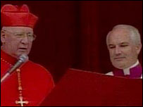 Anúncio Joseph Ratzinger é anunciado como novo papa pelo cardeal chileno Jorge Arturo Medina Estivez para uma multidão na praça São Pedro, no Vaticano.
