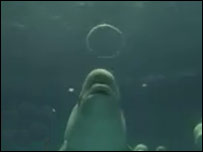 Uma baleia Beluga vem encantando o público japonês com um truque inusitado: ela aprendeu a soprar anéis de ar perfeitamente redondos. Aliya é uma das muitas baleias que atraem o público com seus truques no aquário da cidade de Hamada, no oeste do Japão. Entre as gracinhas das baleias estão dar cambalhotas, passar por dentro de argolas e jogar bola. Mas a grande novidade são os anéis de ar de Aliya, que às vezes são soprados na direção do público. A baleia aprendeu a soprar os anéis em dezembro e nunca mais parou. Primeiro, ela tinha que subir para a superfície para respirar. Agora são os tratadores que fornecem o ar para o truque, com o auxílio de um equipamento de mergulho. Já se sabia que alguns golfinhos e baleias selvagens faziam isso espontaneamente. A expectativa dos tratadores é que agora os outros animais do aquário aprendam com Aliya a fazer os anéis de ar. |