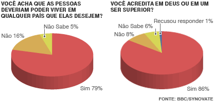 Entre os que acham que seus governos não fazem o bastante para combater o problema, estão empatados em primeiro lugar os do Rio de Janeiro e os de Bagdá (90%). População e religião A grande maioria dos respondentes (86%) disse acreditar em Deus, variando entre 100% em Lagos e 61% em Moscou. A religião pode ser uma barreira para uma integração maior, com 47% dos jovens dizendo que não se casariam com alguém que tenha outra fé. Neste quesito, os jovens cariocas são exceção, com o maior índice de respondentes (81%) dizendo que se casariam com parceiros de outras religiões. Os que negaram em maior número esta possibilidade foram os respondentes em Bagdá (4%) e Nova Déli (13%). | NOTÍCIAS RELACIONADAS Geração do Futuro: BBC quer saber o que os jovens pensam02 de dezembro, 2006 | Fórum Banda brasileira vai a Londres para final de concurso da BBC29 novembro, 2006 | BBC Report Países em desenvolvimento devem investir nos jovens, diz Bird16 de setembro, 2006 | Economia Bebedeira entre jovens aumenta e causa preocupação na Inglaterra17 novembro, 2006 | BBC Report Blog de jovem iraquiana vira peça em Edimburgo15 de agosto, 2006 | Cultura & Entretenimento Jovens com câncer de ovário ainda podem ser mães, diz estudo12 novembro, 2006 | BBC Report Jovens incendeiam ônibus na periferia de Paris26 de outubro, 2006 | Notícias Combate ao trabalho infantil 'avançou no Brasil', diz especialista22 agosto, 2006 | BBC Report | |||||||||||||||||||||||||||||||||||||||||||||||||||||||||||||||||||||||||||||||||||||||||||||||||||||||||||||
