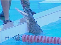 Um grupo de crianças no norte da Austrália encontrou um crocodilo na piscina da escola onde estudam. As crianças, que estudam em uma escola de Darwin, notaram um vulto escuro em um canto de um gramado, que entrou às pressas na piscina. Em meio aos gritos de pânico, os estudantes notaram que se tratava de um crocodilo. O réptil de 1,6 metro permaneceu debaixo d'água por mais de duas horas antes de ter sido dominado por um funcionário, que conseguiu amarrar o animal, tirá-lo da piscina e levá-lo para uma fazenda de criação de crocodilos próxima. Teorias Acredita-se que o réptil andava em busca de águas mais calmas, no momento em que regiões no norte da Austrália estão sendo afetadas por enchentes. Outra teoria é de que o crocodilo foi solto deliberadamente perto da área da piscina, como uma travessura. Outro crocodilo foi visto nadando perto de um bloqueio da polícia, nos arredores da cidade de Ingham, no nordeste de Queensland. As autoridades alertaram para que todos tenham cuidado e evitem atividades como nadar em rios ou baías. | NOTÍCIAS RELACIONADAS Homem é preso com crocodilo e 6 cobras em aeroporto de Hong Kong11 janeiro, 2007 | BBC Report Guardas da Flórida capturam 'crocodilo assassino'14 de maio, 2006 | Notícias Crocodilo 'devora' serra elétrica na Austrália28 de abril, 2006 | Notícias Australiana de 61 anos é premiada por enfrentar crocodilo28 de fevereiro, 2006 | Notícias Mutirão no Zimbábue tira homem da boca de um crocodilo 07 fevereiro, 2006 | BBC Report Excesso de crocodilos obriga Austrália a fechar parques08 maio, 2005 | BBC Report | |||||||||||||||||||||||||||||||||||||||||||||||||||||||||||||||||||||||||||||||||||||||||||||||||||||||||||||