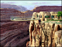 Uma ponte com assoalho de vidro, em forma de ferradura, vai permitir que visitantes "passeiem pelo céu" do Grand Canyon, no Arizona, Estados Unidos, e admirem uma paisagem que, até hoje, era privilégio exclusivo das águias. A atração, batizada de Skywalk (caminhada no céu, em tradução literal), ficará suspensa mais de 1,6 km acima da base do Canyon e se projetará cerca de 21 metros da borda do precipício. A obra, de arquitetura ousada, tem inauguração programada para 28 de março, mas já está provocando protestos de ambientalistas, incomodados com uma construção que altera o que é para muitos americanos um monumento sagrado. A iniciativa é da tribo Hualapai, dona do local, no lado oeste do Grand Canyon. Os índios argumentam que o turismo trará desenvolvimento econômico para a região. Com cerca de 2 mil índios, a comunidade Hualapai sofre com um alto índice de desemprego (cerca de 50%), consumo de drogas e alcoolismo. A nova atração, que vai custar US$ 40 milhões, fica a vários quilômetros de distância do Parque Nacional do Grand Canyon. Segundo os índios, ela representa uma ótima opção para os turistas, que, no momento, só podem admirar as belezas do Grand Canyon no parque, que está sempre lotado. Se a atração trouxer o número esperado de visitantes, os Hualapai planejam construir hotéis, restaurantes e até um campo de golfe no local. Os ingressos para visitantes custarão US$ 25, cerca de R$ 53, por pessoa. |
