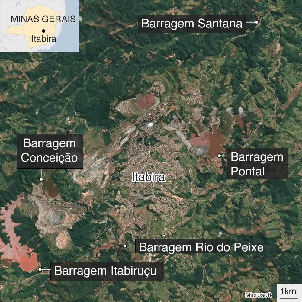A Vale é dona de uma delas, próxima a cidade de Barão de Cocais, a mais de 120 km de Brumadinho. A outra, próxima à Itatiaiuçu e a apenas 30 km de Brumadinho, é controlada por outra mineradora, a ArcelorMittal.