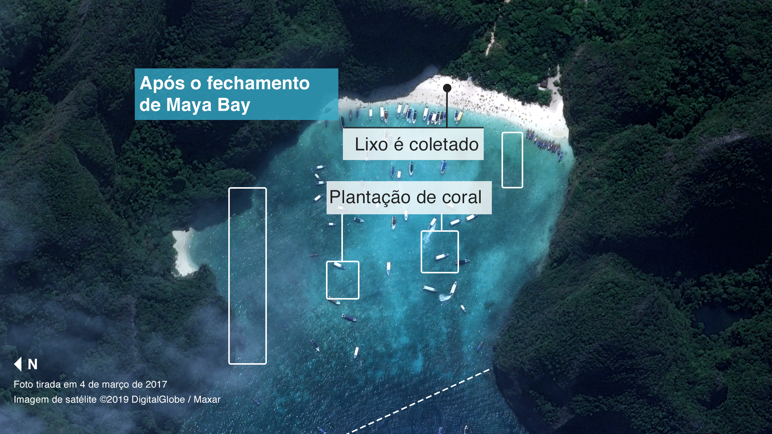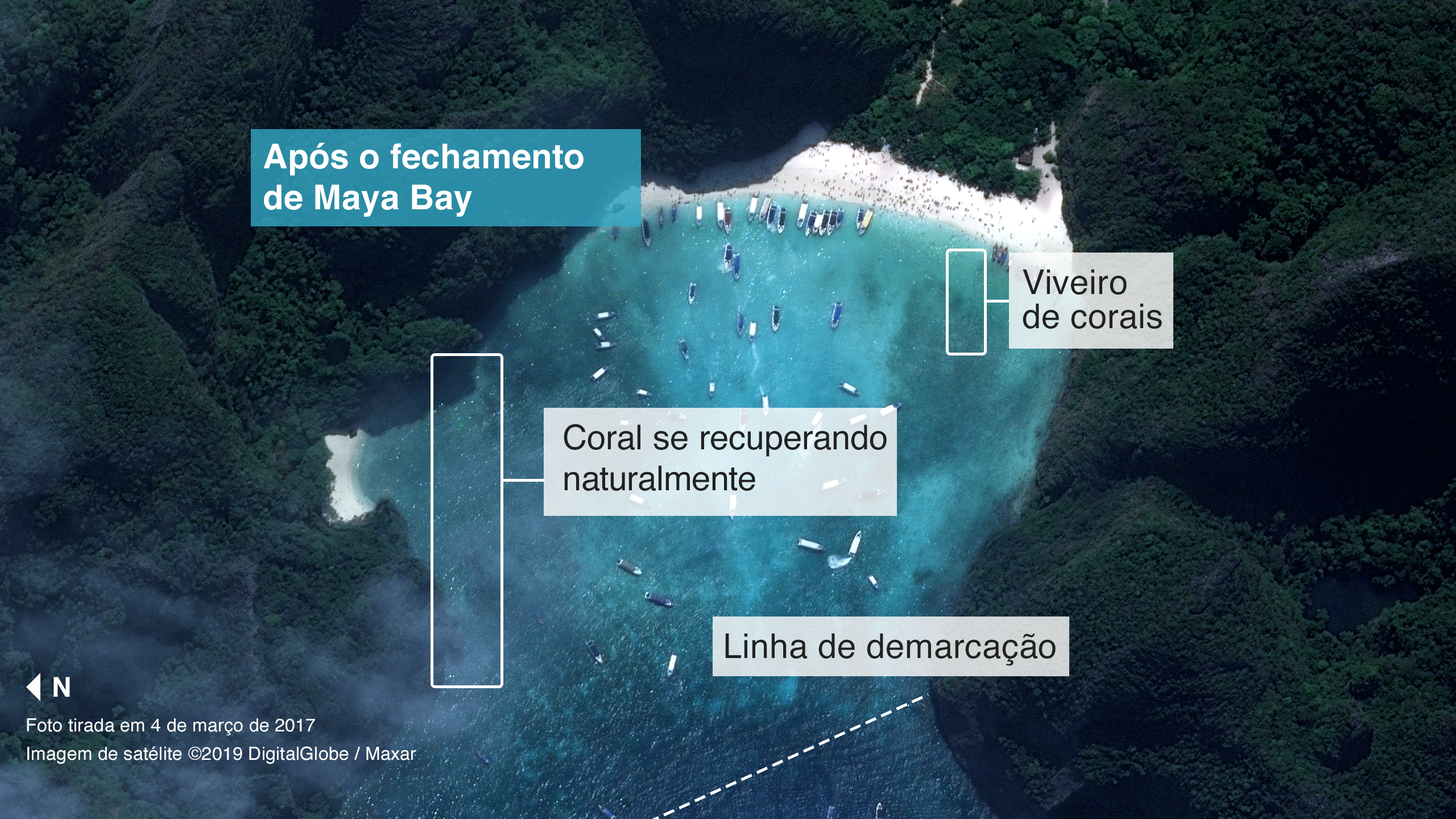 Após mais de seis meses de esforços de conservação, associados à proibição de toda a atividade humana na baía, é possível observar alguns sinais positivos. Um mergulhador nos mostrou como novos corais estavam começando a crescer - embora leve décadas até que atinjam a maturidade.