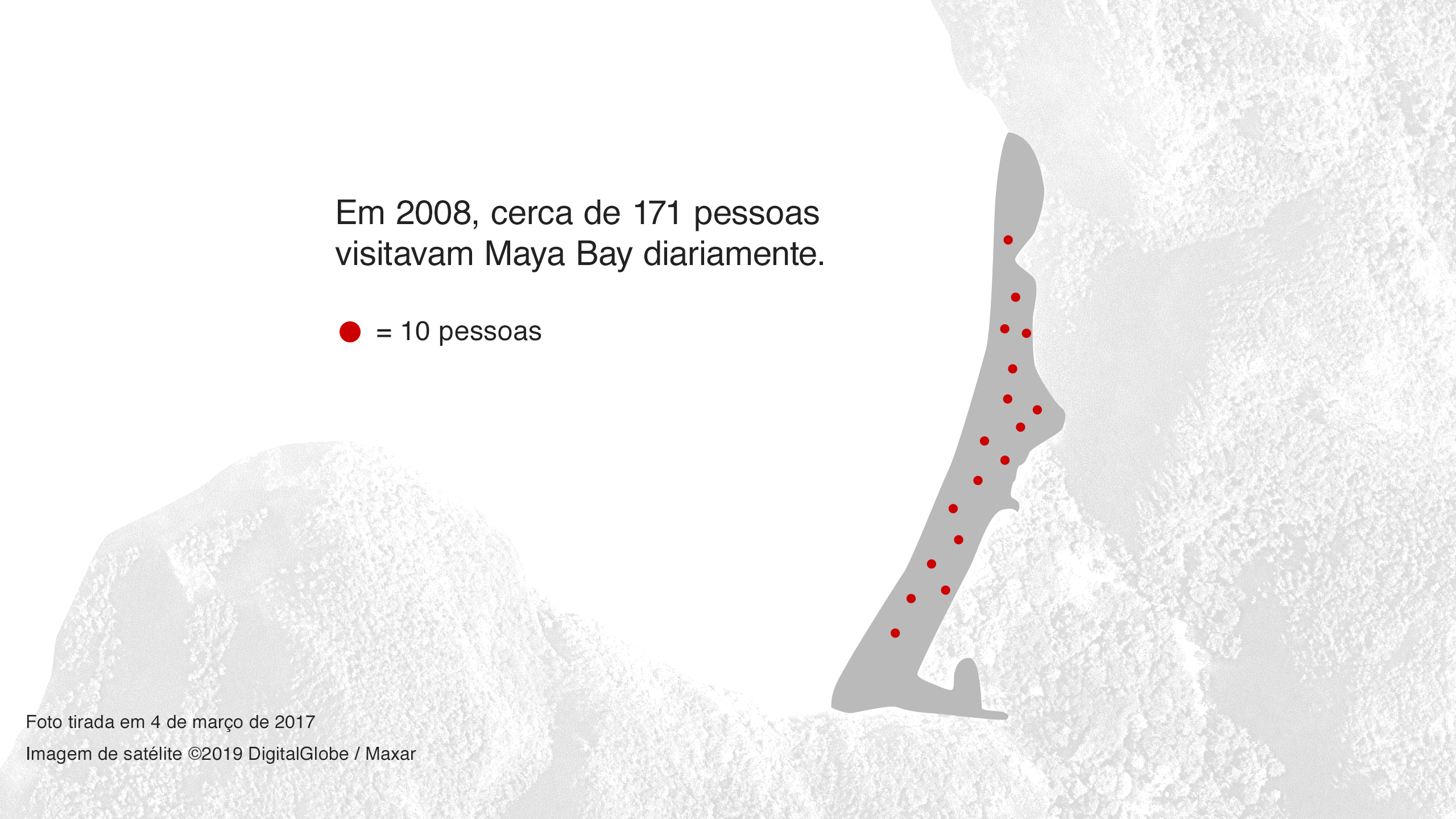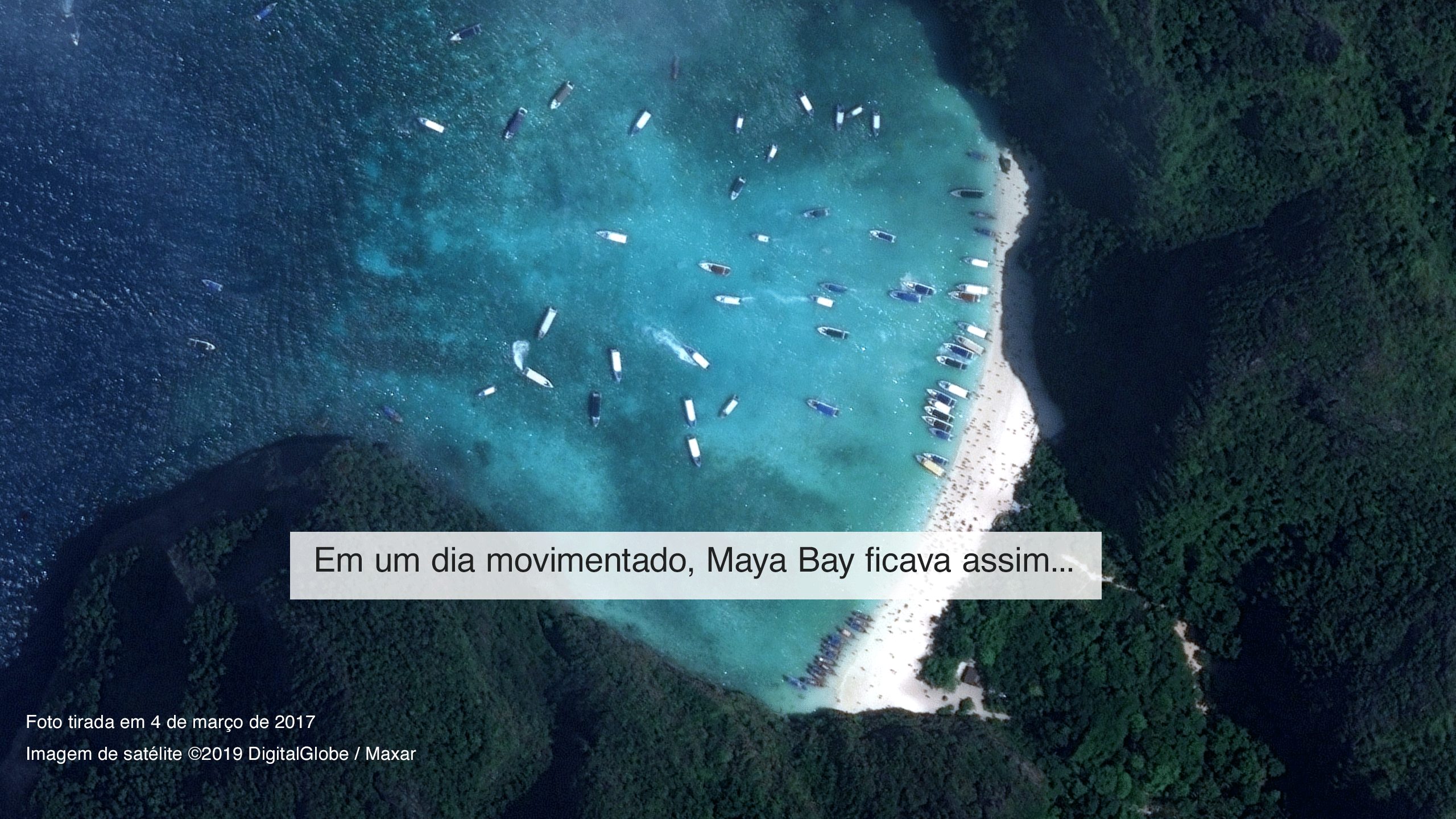 Os barcos cobriam quase toda a extensão da baía - enquanto outros faziam fila para lançar suas âncoras. Às vezes, havia tão pouco espaço na areia que as pessoas precisavam ficar em pé sem conseguir relaxar e contemplar a paisagem. Com o tempo, as avaliações do TripAdvisor se tornaram cada vez mais exacerbadas por causa das multidões, com Maya Bay sendo classificada como "imunda" e "nojenta".
