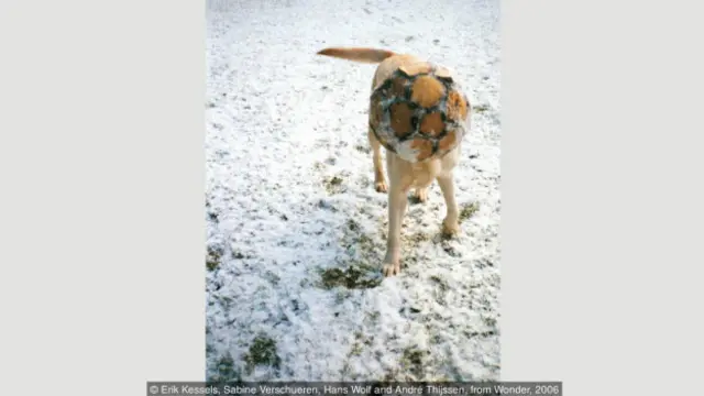 Uma bola de futebol temporariamente sobreposta sobre a cabeça de um cachorro resulta em uma imagem ao mesmo tempo surreal e cômica.