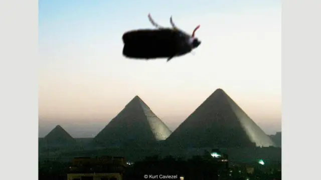 Uma vista serena das pirâmides de Gizé – mostradas nesta foto de Caviezel – é estranhamente interrompida por um inseto gigante.