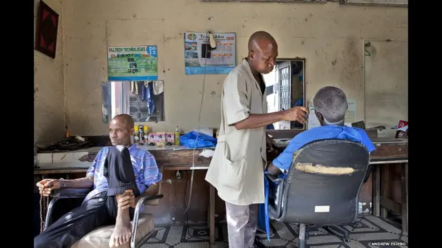 Legenda da foto, Uma exposição do fotógrafo nigeriano Andrew Esiebo, que mostra barbearias em oito países do oeste da África. Acima, uma barbearia em Abidjan, na Costa do Marfim. (Foto: Andrew Esiebo)