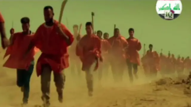 A cena, claro, não é real e, sem dúvida, não é de um dos vídeos postados na web pelo grupo autodenominado Estado Islâmico.